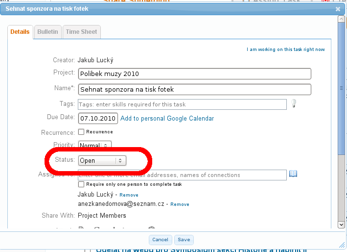 Přepínač "Status" umožňuje upravit stav úkolu