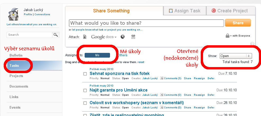 Po přihlášení se vám pravděpodobně zobrazí tzv. Bulletin, to je stručný přehled poslední aktivity (něco jako Zeď na Facebooku). Na seznam vašich úkolů se můžete přepnout pomocí tlačítka Tasks vlevo (viz. obrázek). Druhé označené tlačítko (prostřední) přepíná mezi zobrazením vašich úkolů (Me) a všech (Others). Třetí označené, přepínač, vám umožní filtrovat úkoly podle jejich stavu.